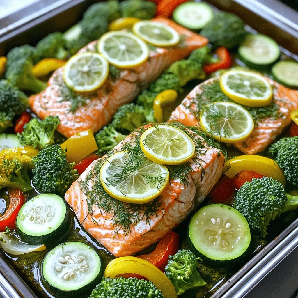 Seasoning is key for flavor. I add salt and pepper to the salmon and veggies. Lemon slices on top of the salmon add a nice touch and enhance the taste. Fresh herbs sprinkled on top make the dish look stunning. They also provide extra flavor that ties everything together.
