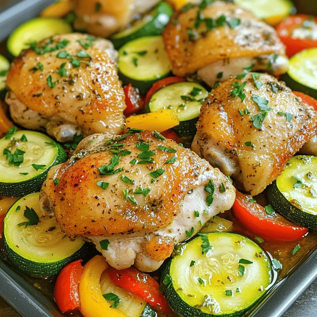 - 4 boneless, skinless chicken thighs - 2 medium zucchinis, sliced into half-moons - 1 red bell pepper, sliced - 1 yellow onion, thinly sliced - 3 cloves garlic, minced - 1 teaspoon dried oregano - 1 teaspoon smoked paprika - 1/2 teaspoon cumin - 1/4 teaspoon red pepper flakes (optional) - 3 tablespoons olive oil - Salt and pepper to taste - Fresh parsley, chopped The main ingredients of this dish are simple yet packed with flavor. Chicken thighs shine here. They stay juicy and tender while absorbing the seasoning well. Zucchini, red bell pepper, and onion add color and texture. Each vegetable brings its own taste to the mix. The seasoning is key. Garlic adds a nice kick. Dried oregano gives a classic Mediterranean touch. Smoked paprika brings a warm flavor. Cumin adds earthiness, while red pepper flakes (if you want some heat) spice things up. The olive oil ensures everything cooks evenly and adds richness. Don't forget salt and pepper to enhance all these flavors. Lastly, fresh parsley brightens the dish. It adds a pop of color and freshness. You sprinkle it on top right before serving. This dish is not just easy to make but also a feast for the eyes and the palate. Preheating the oven Start by preheating your oven to 425°F (220°C). This high heat helps the chicken cook quickly and keeps it juicy. Marinating the chicken In a large bowl, combine the four boneless, skinless chicken thighs with minced garlic, dried oregano, smoked paprika, cumin, and red pepper flakes if you like spice. Add three tablespoons of olive oil, along with salt and pepper. Toss everything together so the chicken is coated evenly with the mix. Let it sit for a few minutes. This step boosts flavor. Arranging vegetables On a large sheet pan, spread out two sliced zucchinis, one sliced red bell pepper, and one thinly sliced yellow onion. Drizzle a little olive oil over the veggies and season them with salt and pepper. Toss to combine so all the veggies are seasoned well. Placing chicken on vegetables Next, arrange the marinated chicken thighs on top of the seasoned vegetables on the sheet pan. This allows the juices from the chicken to soak into the veggies as they cook. Baking time and temperature Place the sheet pan in the preheated oven. Bake for 25-30 minutes. This time allows the chicken to cook through while the veggies become tender. Checking for doneness To ensure the chicken is done, check that its internal temperature reaches 165°F (75°C). You can use a meat thermometer for this. If you don’t have one, cut into the chicken. It should no longer be pink inside. After checking, let the pan sit for five minutes before serving. This helps the juices settle. To achieve perfectly cooked chicken, start with even-sized pieces. This helps the chicken cook at the same rate. I recommend using boneless, skinless chicken thighs. They stay juicy and tender. Next, marinate the chicken for at least 30 minutes. This allows the flavors to soak in. Use a mixture of olive oil, garlic, and spices for great taste. For roasting vegetables, cut them into similar sizes. This ensures even cooking. Use a high heat, like 425°F. It helps to caramelize the veggies and enhance their flavor. To boost flavor, try adding a pinch of lemon zest. It adds brightness to the dish. You can also mix in fresh herbs like thyme or rosemary. They pair well with Mediterranean flavors. Combining different vegetables can create a colorful and tasty dish. Consider adding cherry tomatoes, eggplant, or bell peppers. They not only add flavor but also make your meal look vibrant. Pair this dish with a side of fluffy couscous or a fresh green salad. These options complement the chicken and veggies well. For sauces or dips, a tangy tzatziki sauce works wonders. You can also serve it with hummus for a creamy touch. Both add extra flavor and richness to your meal. {{image_2}} You can change the chicken in this recipe. Chicken thighs are juicy and tender. However, chicken breasts work too. They cook faster but can dry out. Just reduce the cooking time to keep them moist. Feel free to swap the vegetables, too. Try eggplant, cherry tomatoes, or bell peppers. Each option brings a unique taste to your dish. They also add color and texture. If you want a gluten-free meal, you're in luck! This dish is naturally gluten-free. Just make sure your spices are certified gluten-free. For a low-carb option, use more zucchini and fewer bell peppers. You can also skip the onion. This way, you keep the meal tasty while reducing carbs. Herbs can change the dish's flavor. Instead of oregano, use thyme or rosemary. Each herb adds a different twist. Adding citrus can brighten the meal. Squeeze fresh lemon or orange juice over the chicken before serving. You can also toss in olives for a briny taste. They pair well with the chicken and veggies. Experiment with these variations to make the dish your own! To keep your Mediterranean chicken and zucchini fresh, store leftovers in the fridge. Place the chicken and veggies in an airtight container. Make sure to let them cool before sealing. This helps keep moisture in. - Use glass or plastic containers with tight lids. - Label the containers with dates for easy tracking. Your leftovers will stay good for about 3 to 4 days in the fridge. When it is time to enjoy your leftovers, reheating properly is key. The best way to heat chicken and veggies is in the oven. This keeps the chicken juicy and the veggies crisp. - Preheat your oven to 350°F (175°C). - Place chicken and veggies on a baking sheet. - Heat for about 15 minutes or until warmed through. You can also use a microwave. However, the oven method is better for texture and taste. If you want to save your meal for later, freezing works great. First, let the leftovers cool completely. Then, place them in freezer-safe containers or bags. Remove as much air as possible to avoid freezer burn. - Use zip-top bags or rigid containers. - Label with the name and date. To thaw, move the conta