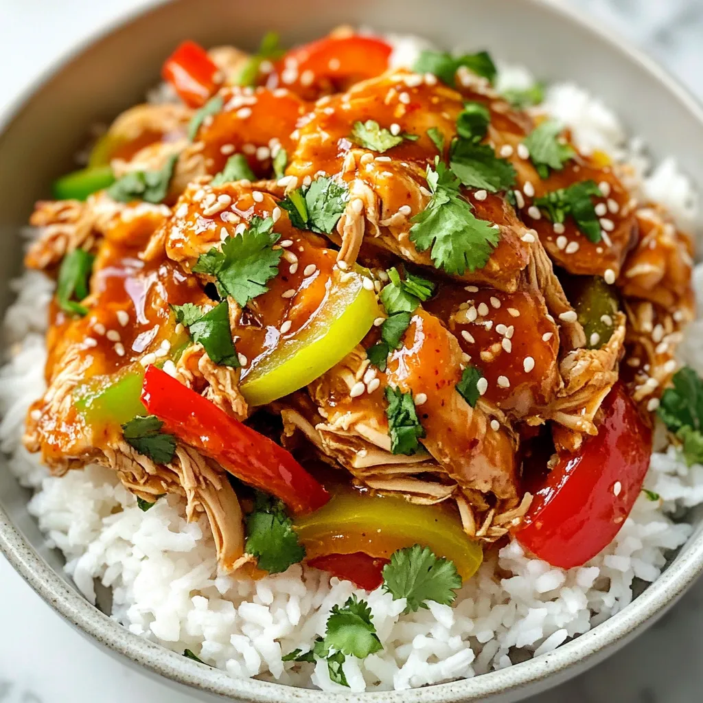 Once the cooking time is up, shred the chicken. Use two forks to pull it apart right in the slow cooker. Mix it well with the vegetables and sauce. This step makes sure every bite is packed with flavor. Serve the sweet chili chicken over cooked rice or quinoa. Garnish with chopped cilantro and sesame seeds for a pretty touch. Enjoy your meal!