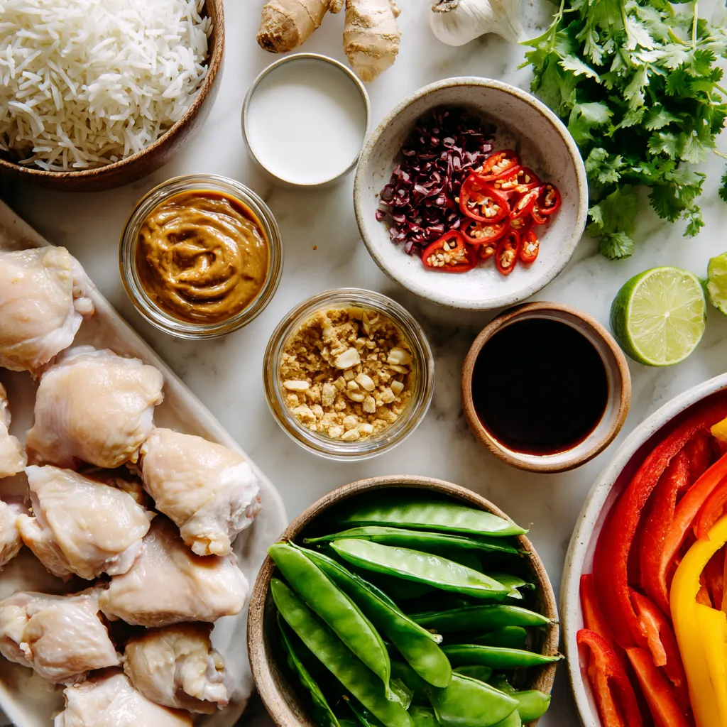 First, gather all your ingredients. You will need chicken thighs, coconut milk, peanut butter, soy sauce, brown sugar, garlic, ginger, red curry paste, bell peppers, snap peas, cilantro, lime juice, and jasmine rice.