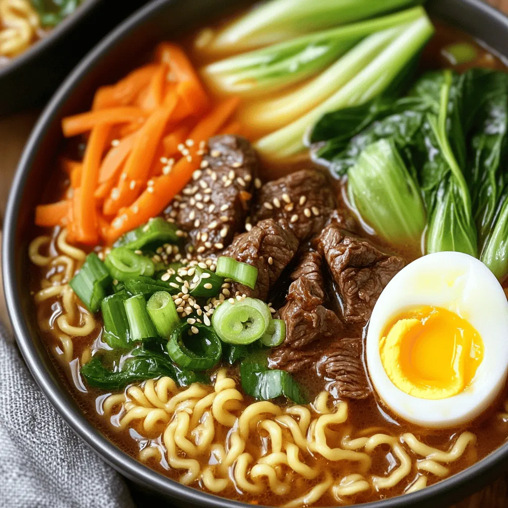 - 200g ramen noodles - 200g beef sirloin, thinly sliced - 2 tablespoons gochujang (Korean chili paste) - 3 cups beef broth - 1 tablespoon sesame oil - 1 tablespoon brown sugar - 1 cup bok choy or spinach - 1 medium carrot, julienned - 1 soft-boiled egg (optional) When preparing your Spicy Korean Beef Ramen, start with the right ingredients. The ramen noodles form the base. Use fresh ones for the best texture. Thinly sliced beef sirloin adds rich flavor and protein. Gochujang gives the dish its signature heat and depth. For the broth, beef broth creates a hearty base. Sesame oil adds nuttiness. Brown sugar balances the spice with sweetness. Fresh vegetables like bok choy or spinach add color and nutrition. Carrots provide crunch and natural sweetness. A soft-boiled egg on top makes it feel special. Gather these ingredients, and you’re ready to create a flavorful meal. Each element plays a part in making this dish truly delightful. To start, get a bowl and add your thinly sliced beef. Then, mix in 2 tablespoons of gochujang, 1 tablespoon of soy sauce, 2 minced garlic cloves, and 1 inch of grated ginger. This spicy blend adds great flavor. Let the beef sit for at least 15 minutes. This helps the meat soak up all those tasty flavors. In a large pot over medium heat, mix 3 cups of beef broth, 1 tablespoon of sesame oil, 1 tablespoon of brown sugar, and the white parts of 2 chopped green onions. Stir well and let it simmer gently. This broth will be the heart of your ramen, so make sure it’s flavorful. Next, heat a small amount of oil in a separate pan over high heat. Add the marinated beef and stir-fry it until it turns brown and is cooked through. This should take about 3 to 4 minutes. Remove the beef from heat when done. In the pot with your broth, add 200g of ramen noodles. Cook them according to the package instructions, usually about 4 to 5 minutes. In the last minute of cooking the noodles, toss in 1 cup of bok choy (or spinach) and 1 julienned carrot. This step adds color and nutrition to your ramen. Allow the vegetables to wilt into the hot broth for that perfect touch. Now, it’s time to serve! Divide the cooked noodles and vegetables into bowls. Pour the hot broth over everything. Top each bowl with the cooked beef. You can also add a soft-boiled egg, chopped green onion tops, and a sprinkle of sesame seeds. This makes your dish look and taste amazing! To make the broth just right, you can adjust the spiciness with gochujang. If you want it hotter, add a bit more gochujang. For a milder taste, use less. Taste as you go. This way, you can find the perfect balance for your palate. Getting the ramen noodles just right is key. Follow the package instructions closely. Usually, it takes about 4-5 minutes. Stir gently to keep them from sticking together. Once cooked, drain them quickly to avoid mushiness. Garnish adds beauty and flavor. Top your ramen with a soft-boiled egg for richness. The egg can be halved for a nice presentation. Sprinkle chopped green onions and sesame seeds on top for color and crunch. Serve in deep bowls to catch all the broth and allow for easy slurping. A drizzle of sesame oil adds shine and flavor too! {{image_2}} You can change the beef in this recipe. Chicken, pork, or tofu work well. Just cut them into thin strips. For chicken, use breast or thigh meat. For pork, choose tender cuts like loin or belly. Tofu gives a nice plant-based option. Press it to remove extra water for the best texture. Want more heat? Add extra gochujang. If you prefer less spice, reduce the amount. You can also add some sugar to balance the heat. Try adding a splash of lime juice for a bright flavor. Always taste as you go to find your perfect level. Feel free to mix in your favorite veggies. Seasonal options include zucchini, bell peppers, or mushrooms. Add them in the last minute of cooking. This keeps them crisp and colorful. You can also use frozen veggies if fresh ones aren't available. They work great too! After enjoying your Spicy Korean Beef Ramen, you may have some leftovers. Store them in an airtight container. Place the beef, noodles, and broth together. Keep the veggies separate to stay fresh. Refrigerate for up to three days. When you want to eat, reheat in a pot. You can add a splash of broth to make it hot and tasty again. Want to save some for later? You can freeze this ramen! First, let it cool down completely. Then, put the noodles and broth in a freezer-safe container. It’s best to freeze the beef and veggies separately. This helps keep their taste and texture. When you’re ready to eat, thaw everything in the fridge overnight. Reheat gently on the stove, adding a little water if needed. Once you cook the ramen, the freshness of ingredients matters. The broth lasts about three days in the fridge. The beef is best eaten within three days too. Cooked veggies can last about two days. Always check for signs of spoilage before eating. If it looks bad or smells off, toss it out. Keeping track of these time frames will help you enjoy your ramen safely. For this Spicy Korean Beef Ramen, I recommend fresh or dried ramen noodles. Fresh noodles cook fast and taste great. Dried noodles are also fine, just follow the package instructions. Make sure they are egg noodles for a richer flavor. You can also try instant ramen, but the taste may not be as good. Yes, you can prepare some parts ahead of time. Marinate the beef a few hours before cooking. You can also cook the broth and store it in the fridge. Just reheat it when you are ready to eat. Cook the noodles fresh when serving for the best texture. The spiciness comes from gochujang, which gives a nice kick. If you like it less spicy, use less gochujang. You can also add sugar to balance the heat. If you want it spicier, add more gochujang or some chili flakes. Adjust it to fit your taste. If you don’t have gochujang, you can use sriracha or chili paste. Mix these with a little sugar to mimic the sweet and spicy flavor of