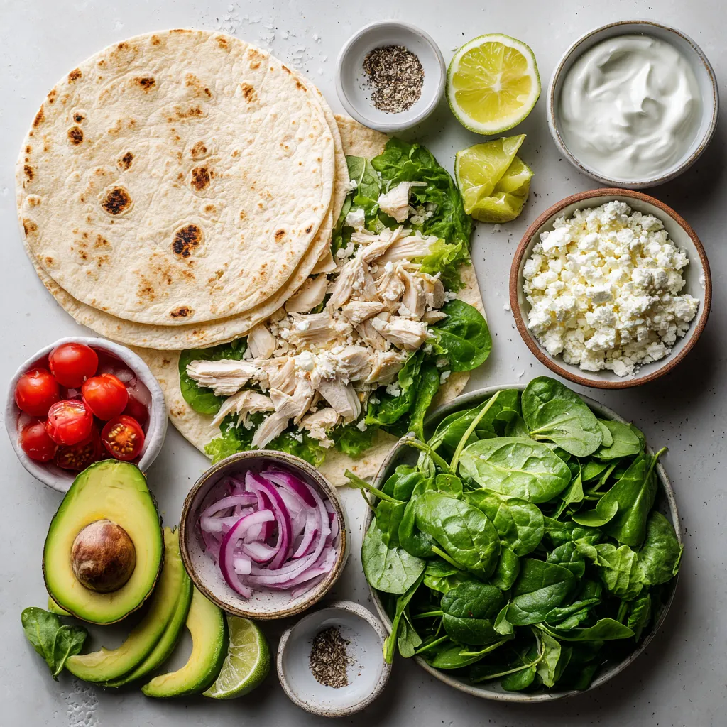 These ingredients make a tasty and filling wrap. The chicken gives protein. The avocado adds creaminess. Mixed greens offer crunch and freshness. Cherry tomatoes and red onion bring sweet and tangy flavors. Feta cheese lends a nice salty bite.